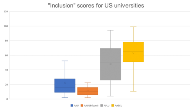 Some of the potentially interesting results of this are shown by the below graph from the Going Global presentation. It shows the distribution of scores (the boxes show where the middle half of institutions sit, with the line being the median) for different groups of US institutions on “inclusion” the metric which measures how many students they admit from low-income backgrounds.