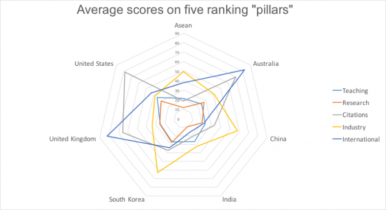 For instance, the new analysis shows how the nations of South East Asia are building a successful regional higher education network centred around the cross-pollination of research and student movement. This graph, which shows how members of the Association of Southeast Asian Nations (ASEAN) compare on average “pillar” scores in the ranking with major countries, provides a taste of this data.