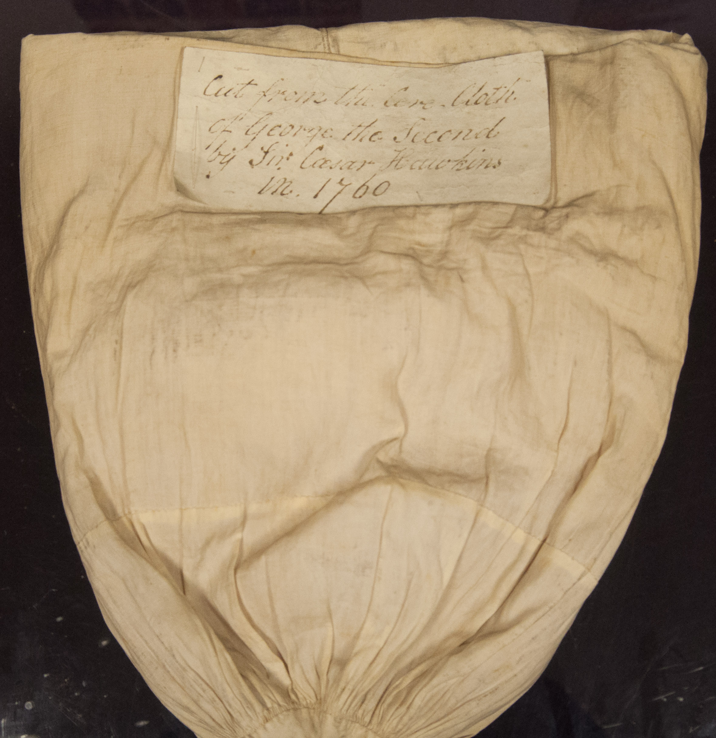 The cloth (pictured below) is called a cerecloth – material treated with wax and used for wrapping dead bodies. It was used for wrapping the dead body of King George II in 1760.