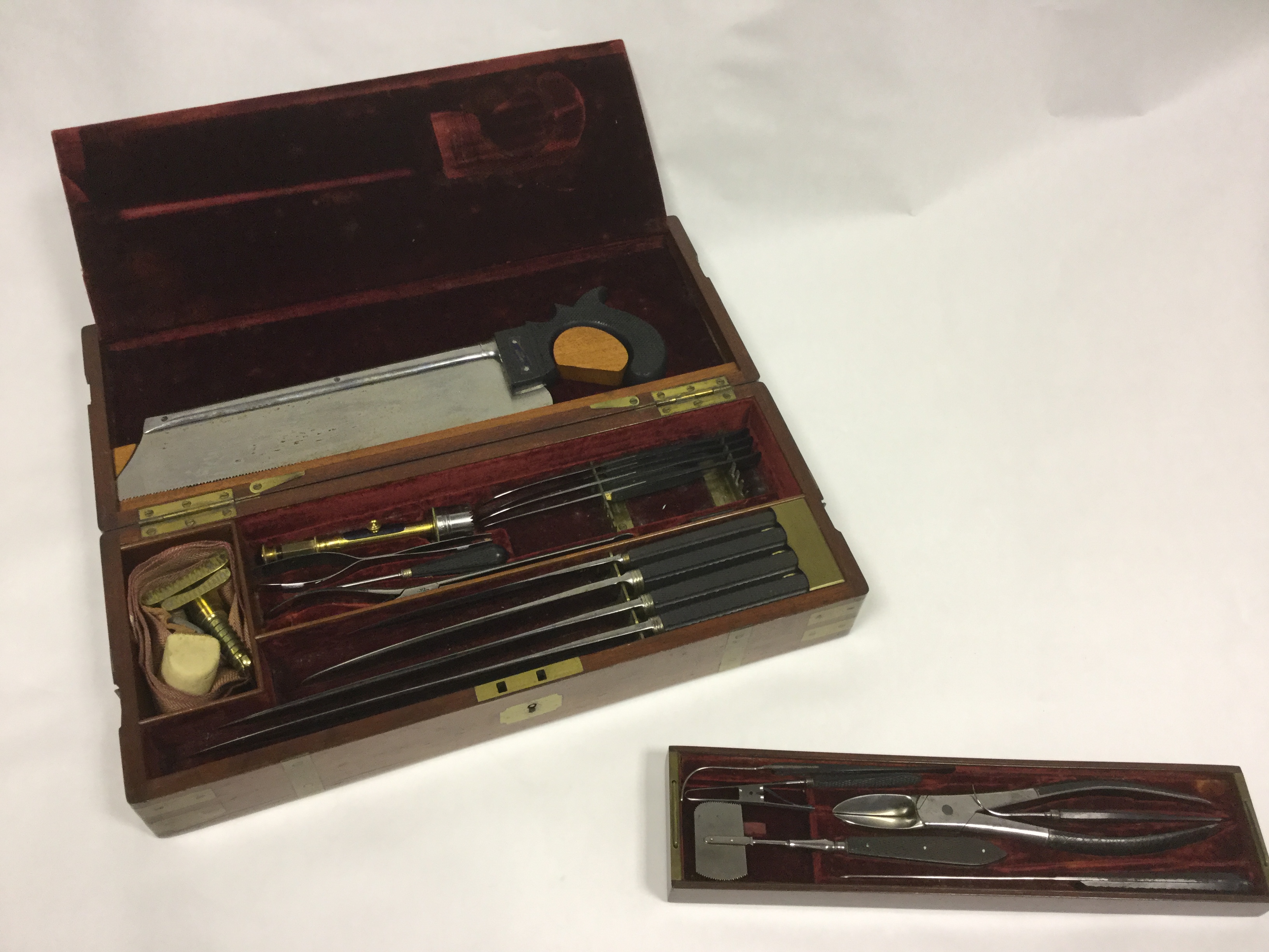 The bone cutters and trepanning tool are part of a set given to student Edward Walker as a "prize" for performing the best dissection during the 1856-1857 teaching year (pictured below). The set housing the tools also contained two mysteriously hidden compartments, concealing a bone saw and tourniquet.