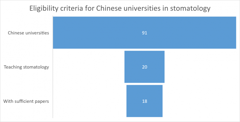 Of the 91 Chinese universities in the China Subject Ratings, 20 provided evidence that they teach courses in the Dentistry subject as defined by the Ministry of Education. Of these 20 universities, 18 were eligible for a grade based on having entered data in the related World University Rankings subject, and having a sufficient number of research papers in the years 2016 to 2021. Globally, 504 universities were eligible for a grade.