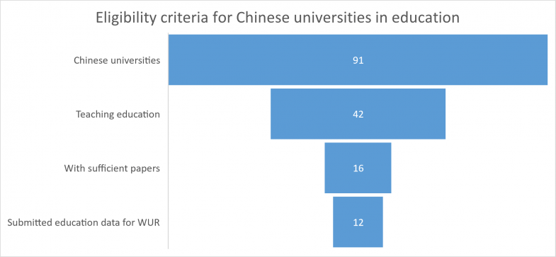 Of the 91 Chinese universities in the China Subject Ratings, 42 provided evidence that they teach courses in the education subject as defined by the Ministry of Education. Of these 42 universities, 12 were eligible for a grade based on them having entered data in the World University Rankings for the education subject, and having a sufficient number of research papers in the years 2016 to 2021. Globally, 590 universities were eligible for a grade.