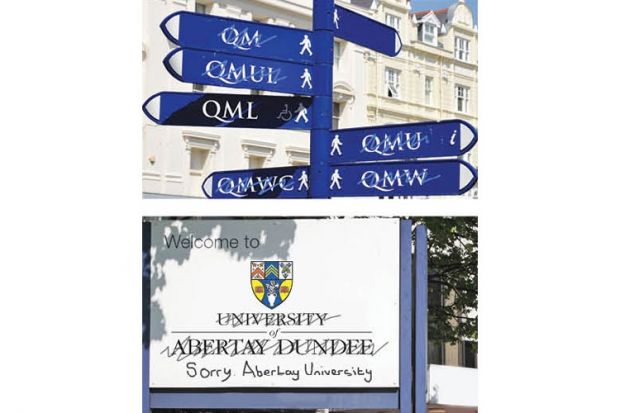 But this revolutionary rebranding by QML (formerly, of course, better known as QM, QMUL, QMU, QMW or QMWC) was, said Ms Edsel, still “almost modest” alongside the even more profound rebranding exercise undertaken in Scotland, where the former “University of Abertay Dundee” had “in a veritable sea change” transformed itself almost overnight into merely “Abertay University”.