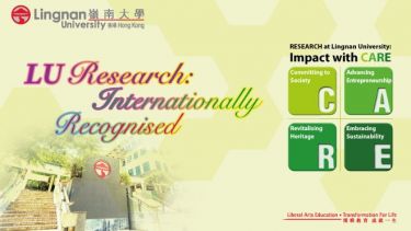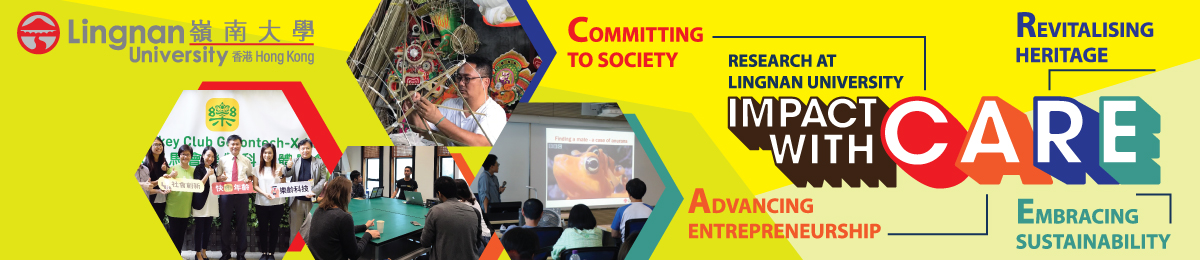 The tagline Impact with CARE encapsulates our research aspirations and summarises succinctly the nature and the scope of research conducted at Lingnan: Committing to Society (research theme of Social Sciences), Advancing Entrepreneurship (in Business research), Revitalising Heritage (in Arts research), and Embracing Sustainability (interdisciplinary research spanning various areas of human endeavours).