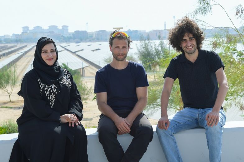 From Left: Dr. Amal Al Ghaferi, Associate Professor, Dr. Matteo Chiesa, Professor and Dr. Harry Apostoleris, Post-Doctoral Fellow, in front of Masdar City’s 10MW solar power plant.
