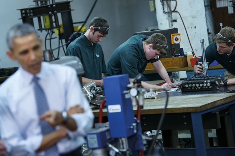 During the study tour, a group of young African American women are taking a class in a cavernous room filled with an array of tools and tech with which you can thermoform the body of a (miniature) car or see what it’s like to work alongside a towering and potentially dangerous robot arm (which considerately stops when it senses a nearby human). Careers information on show explains that a forging machine setter’s job carries a wage of $22 to $28 an hour and can be entered through a two-year course in machine tool technology at nearby Lakeland Community College.