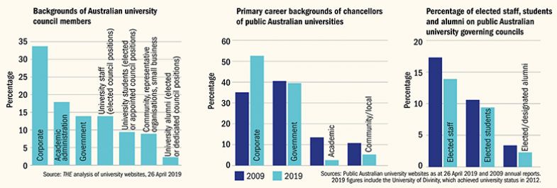 Back in Australia, higher education consultant and governance expert Hilary Winchester says the shrinking of university councils over the past decade has diluted staff and student representation and left them looking more like corporate boards. “The composition of those councils has predominantly been people from business and industry rather than higher education,” says Winchester, a former pro vice-chancellor of the University of South Australia.