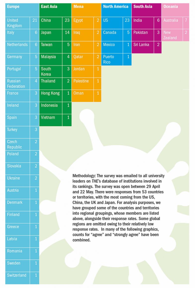 These are the kinds of issues that Times Higher Education has sought to explore with our latest global survey of university leaders, focused on the Covid-19 pandemic. During the first three weeks of May, we surveyed 200 leaders of prestigious universities around the world. The results – from 53 countries or territories, across six continents – paint a picture of a sector whose chief concerns inevitably vary by region and system, but that is united in seeing the coronavirus pandemic as a potentially game-changing event in the modern history of higher education.