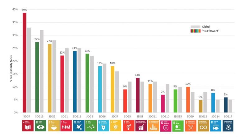 Quality education measures indicators such as universities’ lifelong learning efforts and the proportion of first-generation students in the population. Climate action (SDG13) and no hunger (SDG2) were the next-highest priorities for “Asia forward” students.