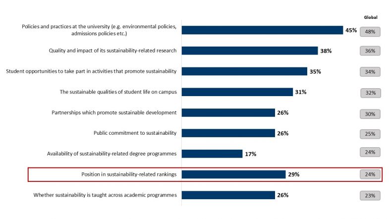 Students were asked about the main factors they used to assess an institution’s reputation for sustainability. While the majority – 45 per cent – used the policies and practices at the university to assess reputation, “Asia forward” students placed a higher level of consideration – 29 per cent – on the university’s position in sustainability rankings, compared with global respondents – 24 percent. This emphasis on a tangible ranking result stresses the importance of a trustworthy ranking system that students are able to refer to when making choices about their education.