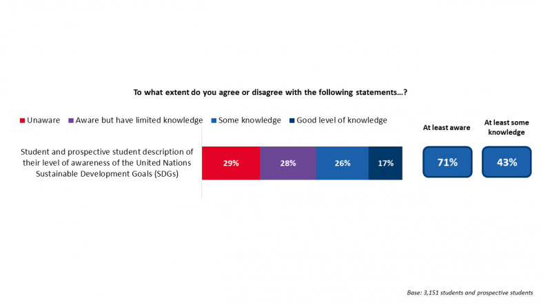 Of all the students who took part in the survey, 71 per cent were aware of the United Nations’ Sustainable Development Goals (SDGs). Broken down, 28 per cent of students were aware of the SDGs but had limited knowledge, 26 per cent had some knowledge and 17 per cent had a good level of knowledge about the SDGs.