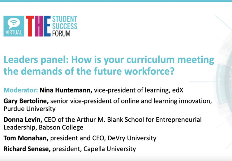 Richard Senese, president of Capella University, told the panel that adaptability is part of his university’s DNA. “Capella was founded on this very question: how do we shorten the distance between education and employment? How do we help professional working adults advance in their careers?” he asked. “I think our secret sauce is in our vision and commitment to the same mission: professionally relevant credentials, flexibility, affordability and personalising the experience. We test ourselves any time we have an innovation against those four [principles].”