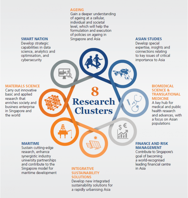 Our strategy targets high-level research over a broad base from which several peaks of excellence naturally arise. To better address the interconnected challenges facing Asia and the rest of the world, we have combined the strengths of our faculties, schools and research institutes and centres to build eight integrative research clusters.