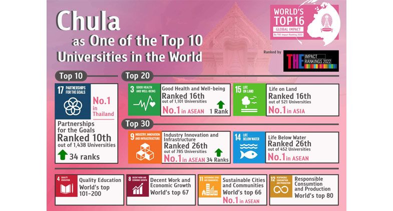 In the latest results of the Times Higher Education (THE) Impact Rankings released on April 27, 2022, Chulalongkorn University has made Thai universities proud by being ranked No. 1 in Thailand for the 3rd consecutive year and top 16 in the world (out of 1,524 institutions from 110 countries), which is the highest ranking ever given to a Thai university.