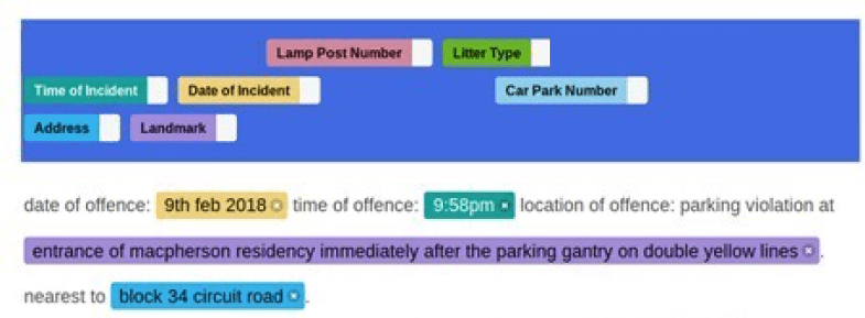 Hence, we set up an annotation framework and get our MSO colleagues to help us annotate the words within the feedback text with labels representing the types of important information required to resolve a case such as the dates and times the incidents occurred, landmarks, and addresses.