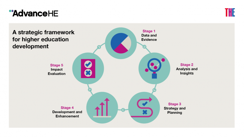 Advance HE and THE Consultancy have partnered to develop a Strategic Change Framework for Sustainability, which is one method of considering the steps required to create robust strategies, policies, processes and practices that embed SDGs across the institution. The framework encourages institutions to consider five steps of managing a change cycle: first, gathering and understanding critical data; second, drawing the right insights and conclusions from the data; third, using that as evidence for strategic planning; fourth, developing the right behaviours, practices and culture; and fifth, measuring and evaluating impact.