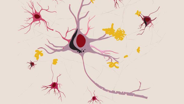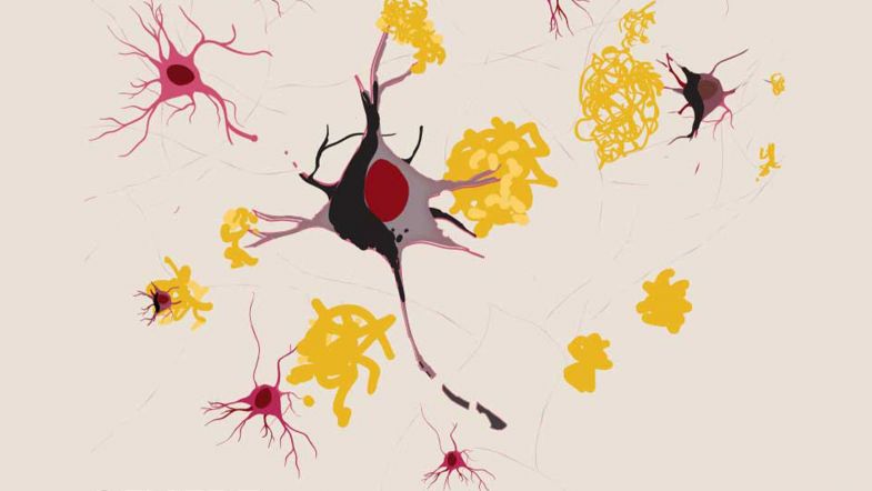 MILD – Amyloid-ß (yellow) starts to accumulate near neurons; tau starts to accumulate inside neurons. Image: Richard Campbell