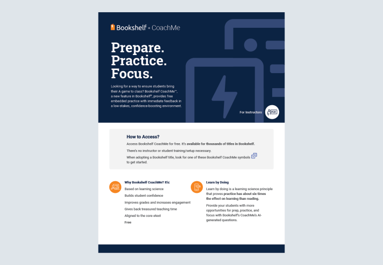 Looking for a way to ensure students bring their A game to class? Bookshelf CoachMe™, a new feature in Bookshelf®, provides free embedded practice with immediate feedback in a low-stakes, confidence-boosting environment.