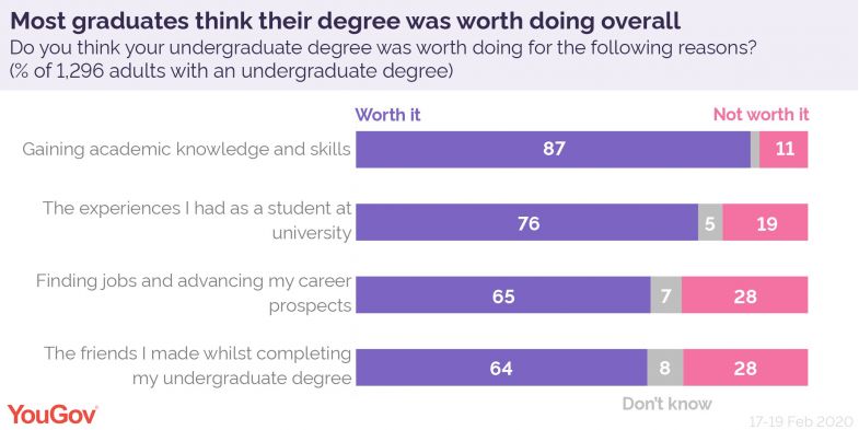 But Freshers’ Week on Zoom may not live up to the experiences of past graduates. University life is important, with 76% saying their degree was worth it for the experiences they had as a student.