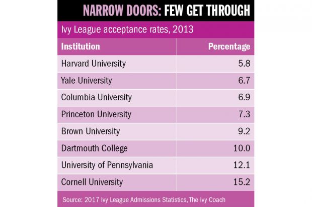 Except for a constant parade of tourists, the Harvard University campus is quiet and uncrowded at this time of year. But that will change in a few weeks, with the arrival of the Class of 2017. It will be an extraordinarily exclusive club. For every applicant accepted by Harvard this year, 16 were turned down, resulting in a record-low admission rate of 5.8 per cent. Other universities in the exclusive Ivy League have equally low admission levels.