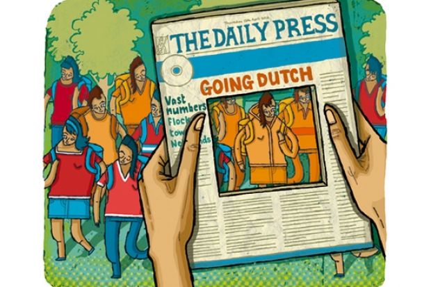 The "Going Dutch" stories read something like this: vast numbers of British students are packing their bags to enrol at Dutch universities; they are heading there because fees are much lower than in the UK; and Dutch institutions offer a range of courses, many of them taught in English. We then have a few selective quotes from happy British students noting how very Continental things feel in Maastricht, how the flat landscape is very conducive to cycling and other such observations.