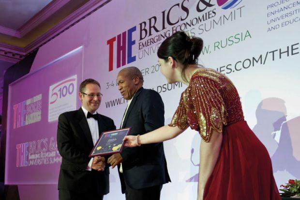 Regionally focused: Malegapuru Makgoba, centre, with Phil Baty, THE rankings editor, at the THE BRICS & Emerging Economies Universities Summit