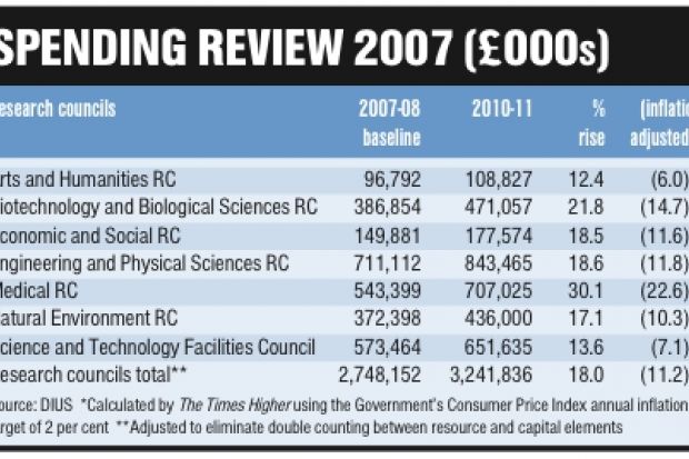 Council budgets, adjusted for inflation by The Times Higher , will rise in real terms from 22.6 per cent in the case of the Medical Research Council to 6 per cent in the case of the AHRC by 2010-2011.