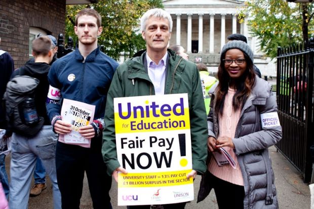 Members from higher education’s three largest unions – the University and College Union, Unite and Unison – joined protests outside university buildings this morning, urging staff not to go to work and students to boycott lessons.