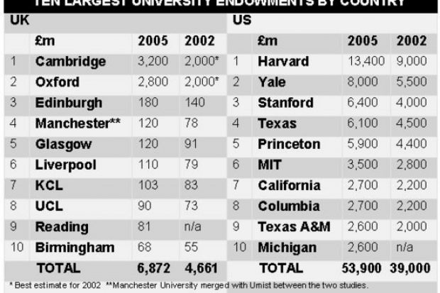 - The difference between the ten largest university endowments in the UK and US has widened by some £12.5 billion in three years.