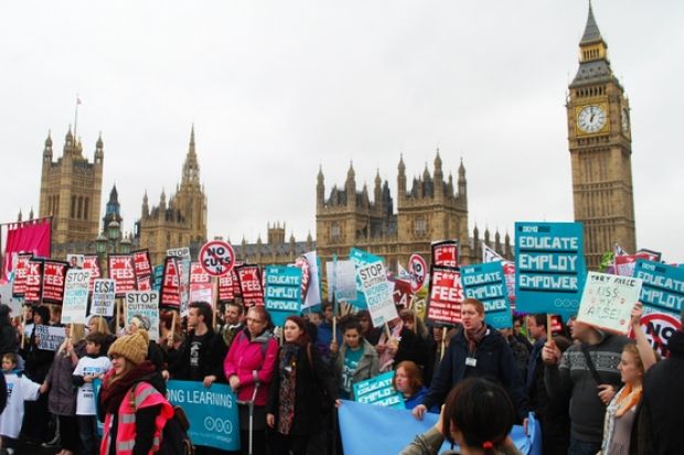 Speaking after the rally, Mr Burns told Times Higher Education that around 10,000 people joined the protest, which was otherwise peaceful and was held under the slogan "Educate, Employ, Empower".