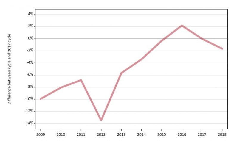 The figures show a continuation of the trend started in 2016, after the removal of student number controls, for lower-tariff universities to lose out to higher-tariff institutions in the competition to increase their undergraduate population.