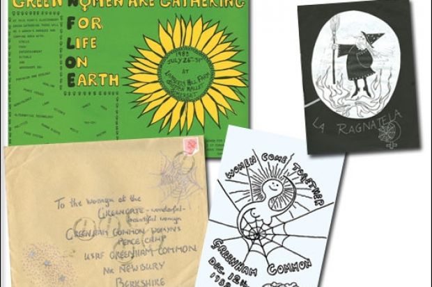 As these examples show, the camp's leaflets, letters, newsletters and photographs often made use of spellings such as "womyn" and bold symbols of personal and political identity - dragons, witches, snakes and spiders' webs - deliberately designed to challenge preconceived ideas about women.