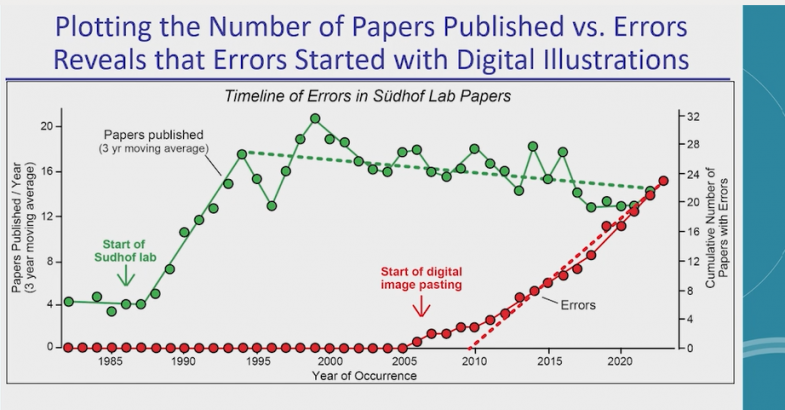 After tracking the incidence of mistakes in his lab, Südhof found mistakes only began to arise when he began digitally processing images, suggesting some of these errors might be “artefacts of digital processing and copy and paste errors” in papers that were “10 or 20 years old”.