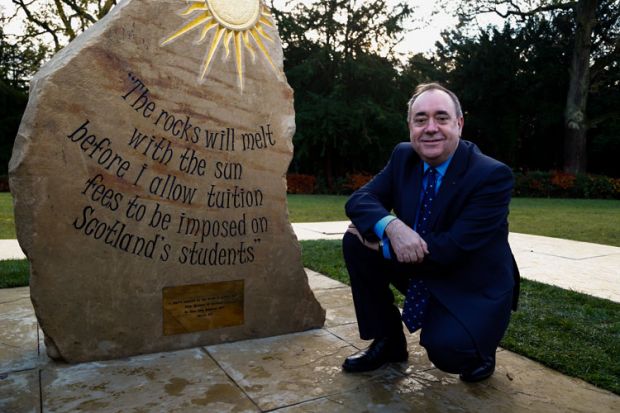 On his penultimate day in office, Scotland’s First Minister unveiled the commemorative stone at Heriot-Watt University inscribed with his March 2011 statement on university costs: “The rocks will melt with the sun before I allow tuition fees to be imposed on Scottish students.”