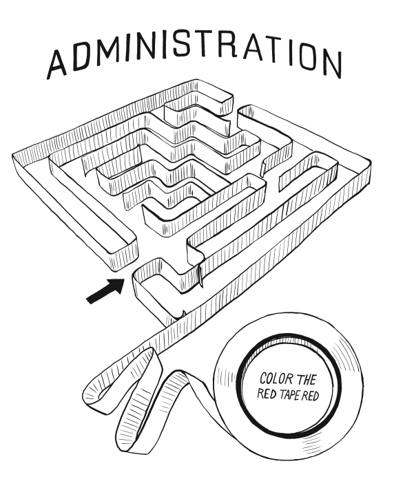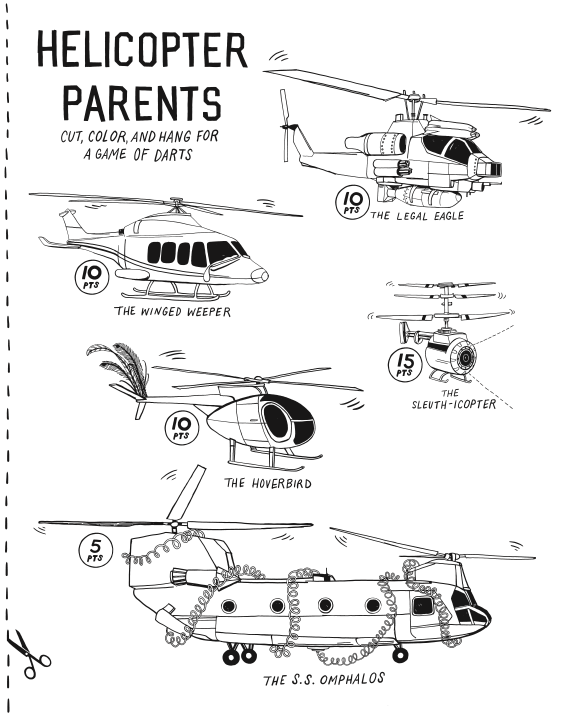 One page invites readers to colour in administrative red tape while another includes five “helicopter parents” to cut, colour and hang for a game of darts.