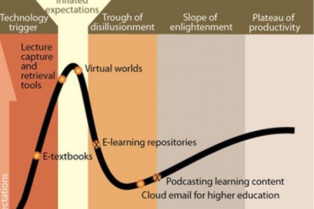 Virtual worlds are about to plunge into a "trough of disillusionment", lecture podcasts are fast becoming obsolete, but cloud computing will soon be on the "slope of enlightenment".