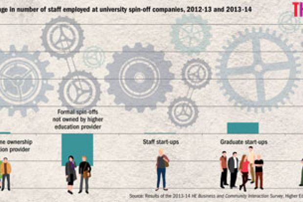The number of new formal spin-off companies fully or partly owned by universities remained flat over the same period. The number of new companies with no institutional ownership fell by a third, and employee numbers overall at such start-ups by 60 per cent.