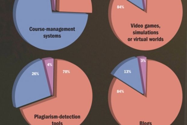 Some 70 per cent did not use plagiarism-detection software and 84 per cent did not use blogs. In each case, a small percentage claimed not to know that such things existed (see graphic, below).