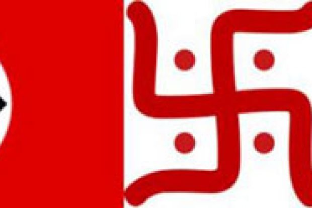 From left: Nazi flag with swastika, a Hindu swastika and a Japanese clan’s swastika