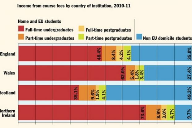 This graph, from a Higher Education Statistics Agency report, shows how institutions in the four nations of the UK rely on very different types of student for their tuition fee income.