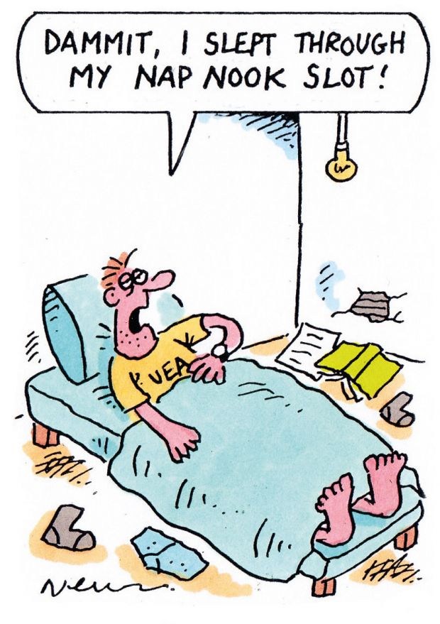 - Dozy students at the University of East Anglia can now grab forty winks between lectures in a dedicated sleeping area, the Eastern Daily Press reported on 4 February. Equipped with comfy beanbags and chairs, pillows and blackout curtains, the “Nap Nook” will allow students to take a 40-minute siesta between midday and 6am, the paper said. The room will be monitored by CCTV to ensure that “it’s only strictly sleeping” and that students are safe, it adds. With many students living in noisy shared houses or close to busy roads, helping them get a decent rest could boost their alertness and, potentially, their grades, says the UEA’s students’ union. Having a kip on campus is nothing new, but the Nap Nook may prove rather more comfortable than the quiet corner of the library most favoured by hard-living students.