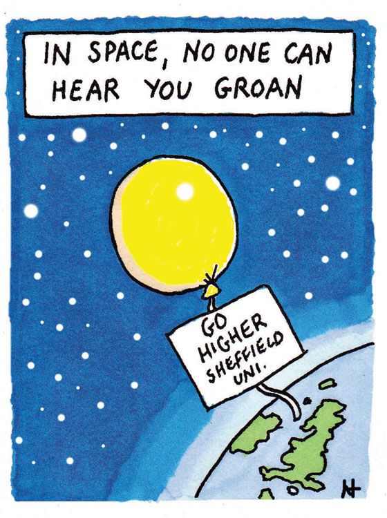 - In an excruciating press release headed “Advertising space: the final frontier”, the University of Sheffield said on 5 August that it had “sent a billboard into space advertising its ‘Go Higher’ campaign aimed at attracting high quality Ucas applications from students during this year’s clearing process”. An accompanying video shows a laminated “Go Higher” card attached to a balloon rising above green fields and into the dark stratosphere. “We have launched hundreds of thousands of people into the academic, professional, political and artistic stratosphere over the years and this campaign is a direct appeal to students who have set their sights higher,” said Gavin Douglas, Sheffield’s head of student recruitment, admissions, international relations – and feeble, overextended puns.