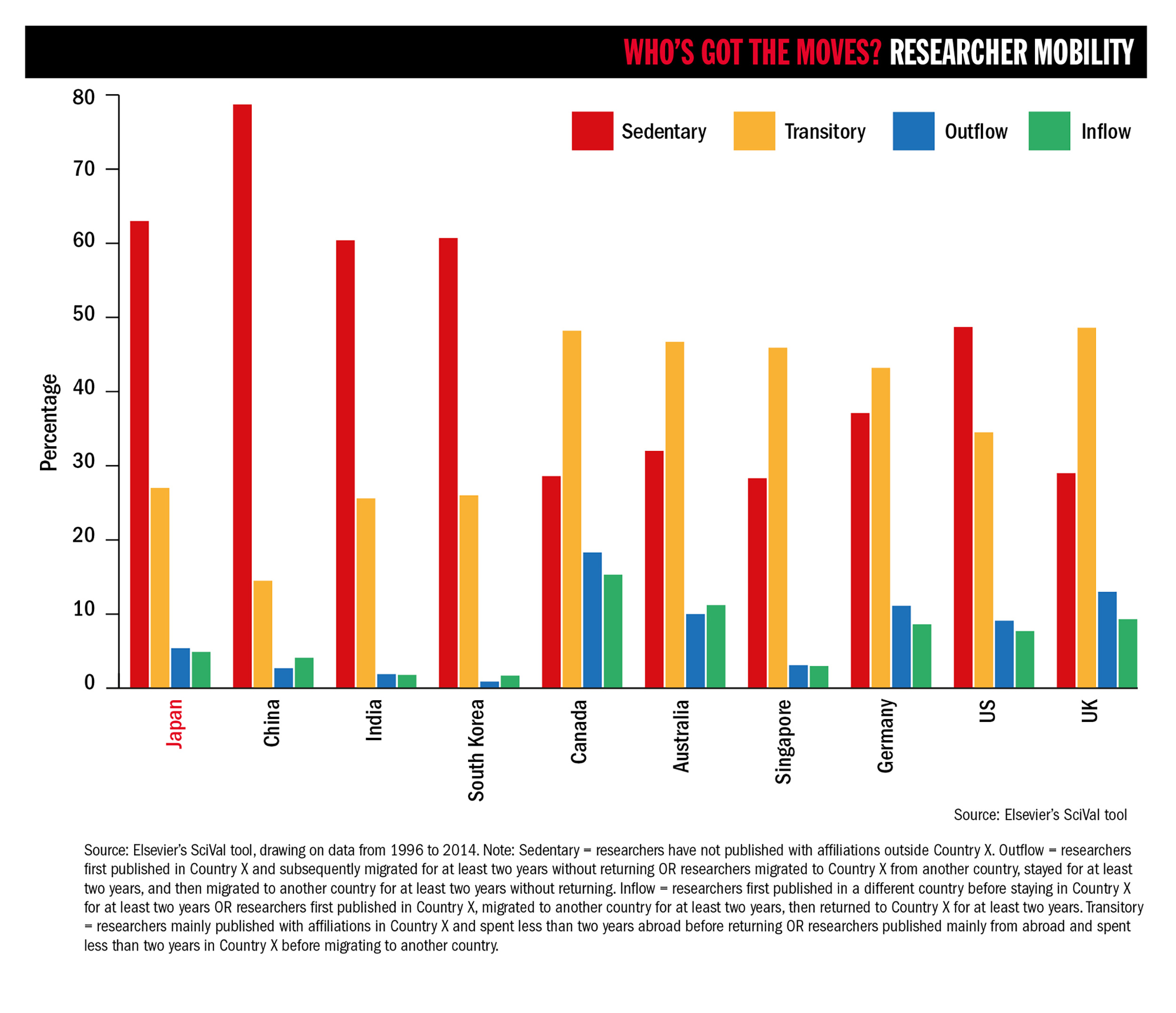 Source: Elsevier’s SciVal tool, drawing on data from 1996 to 2014. Note: Sedentary = researchers have not published with affiliations outside Country X. Outflow = researchers first published in Country X and subsequently migrated for at least two years without returning OR researchers migrated to Country X from another country, stayed for at least two years, and then migrated to another country for at least two years without returning. Inflow = researchers first published in a different country before staying in Country X for at least two years OR researchers first published in Country X, migrated to another country for at least two years, then returned to Country X for at least two years. Transitory = researchers mainly published with affiliations in Country X and spent less than two years abroad before returning OR researchers published mainly from abroad and spent less than two years in Country X before migrating to another country.