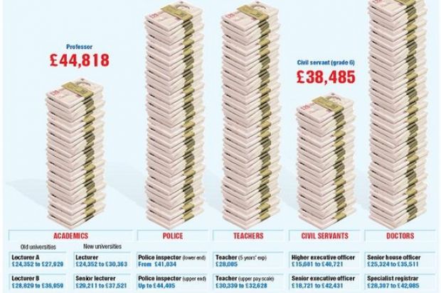 The overall pay gap is highlighted by average pay figures. According to the Office of National Statistics, in 2005 academics earned a mean of £40,657 a year compared with £51,487 for police inspectors and above; Pounds 32,878 for teachers; £81,744 for doctors; and £71,824 for civil servants (grade 5-plus or equivalent).