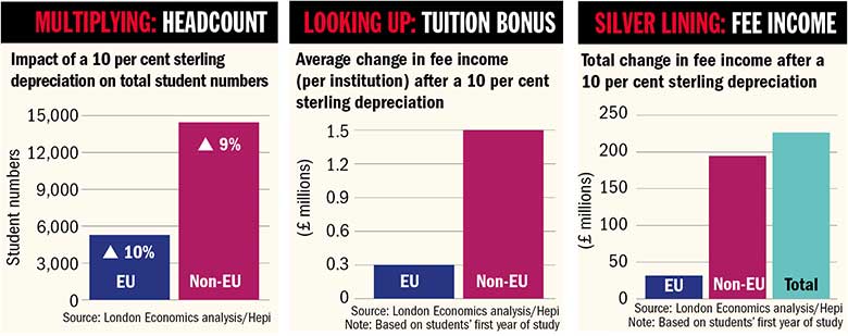 But the positive impact from sterling’s depreciation “assumes that the resulting additional 20,000 students are permitted to study in the United Kingdom. If this is not the case, then the £227 million potential gain that might be achieved by UK higher education institutions may not be realised or only realised in part – thus representing the potential loss associated with restricting international student numbers”, the report says.