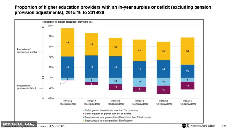 Speaking at the same event, Ashley McDougall, the director for local service delivery and value for money at the National Audit Office – which oversees the OfS’ work on assessing financial sustainability – said that in 2020-21, the number of providers in deficit had actually shrunk compared with 2019-20: from a third to closer to 25 per cent after many came through the pandemic in a lot better financial state than expected.