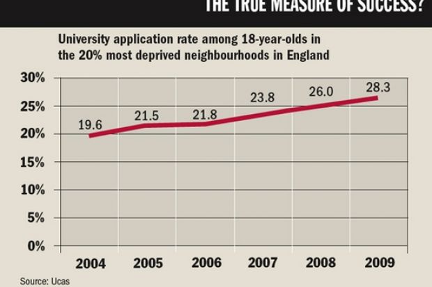 For instance, the application rate among 18-year-olds from the 20 per cent most deprived neighbourhoods in England rose from 19.6 per cent in 2004 to 28.3 per cent in 2009, according to the latest official figures from the Universities and Colleges Admissions Service. Since then, the rate has climbed further, to 31.7 per cent in 2010, Mr Harrison said.