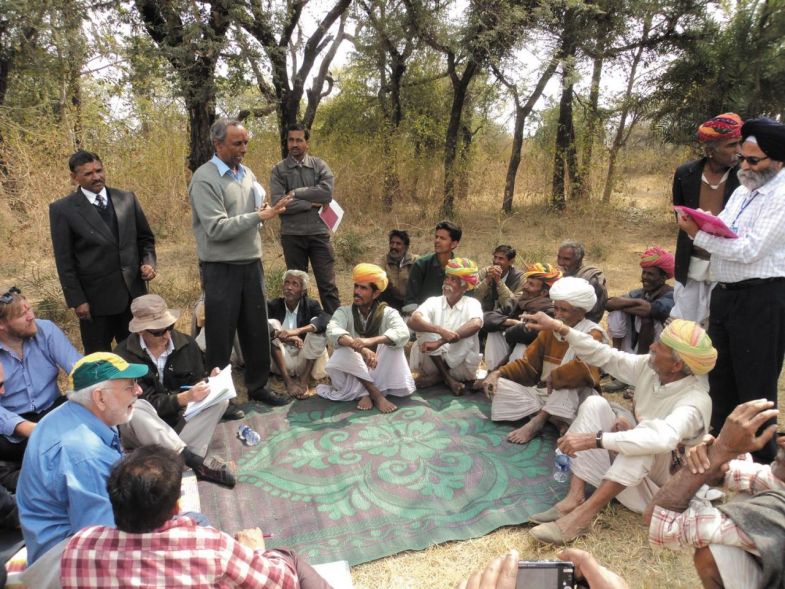 Image: Basant Maheshwari and colleagues meeting with farmers in Sundarpur. (credit N/A)