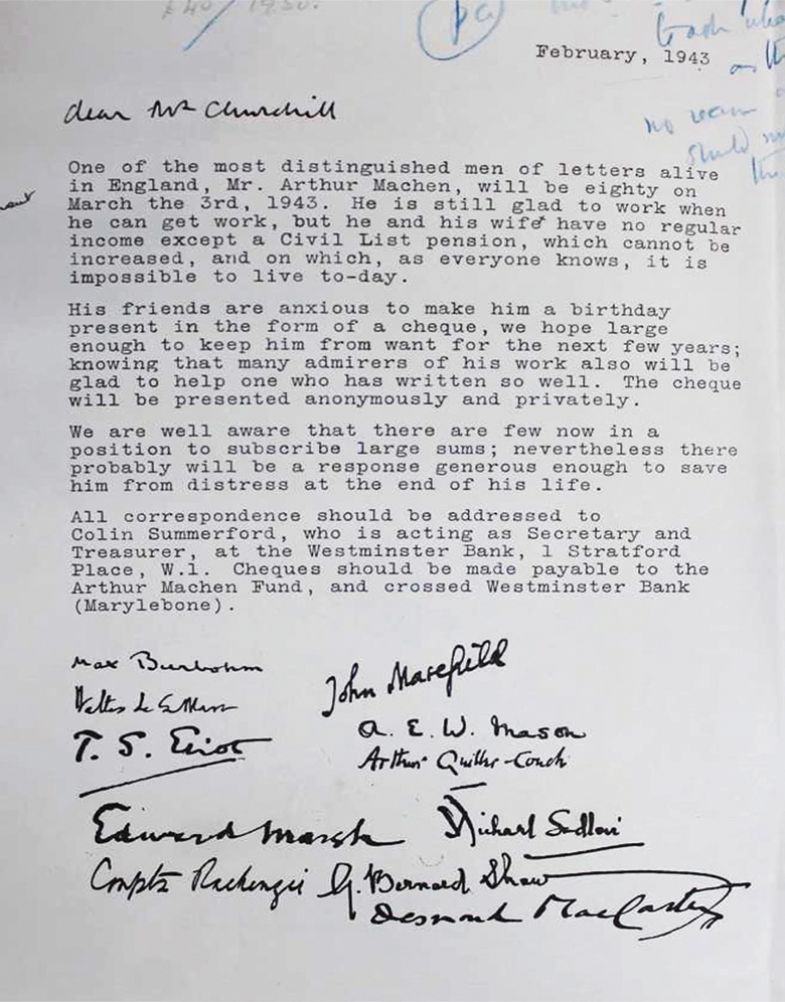 Then there is the 1943 letter to Winston Churchill (below), signed by a list of literary luminaries including T. S. Eliot and John Masefield, requesting a contribution to a fund to help alleviate the penury faced by the now largely forgotten horror writer Arthur Machen (described as “one of the most distinguished men of letters alive in England”) as he approached his 80th birthday.
