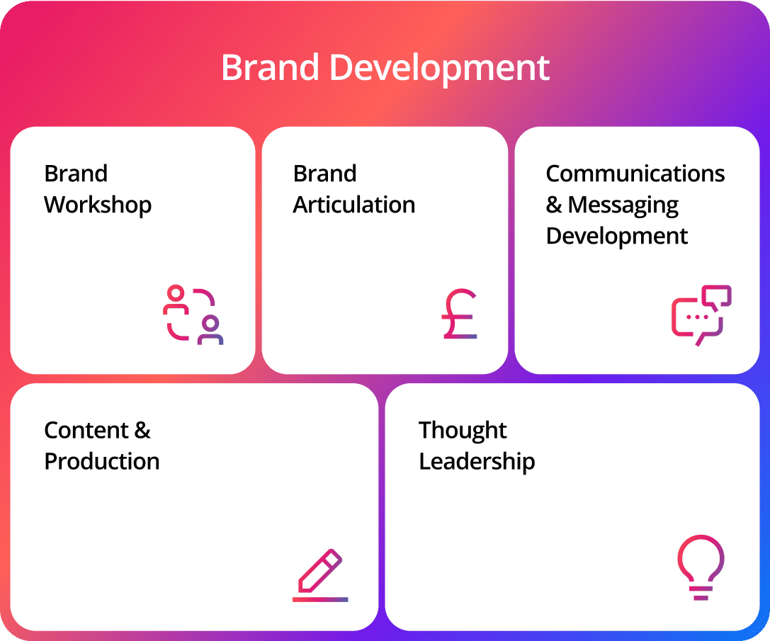 Our team will work with you to articulate your brand & bring the brand narrative to life - including the creation of a messaging framework, thought leadership papers & rich media solutions.